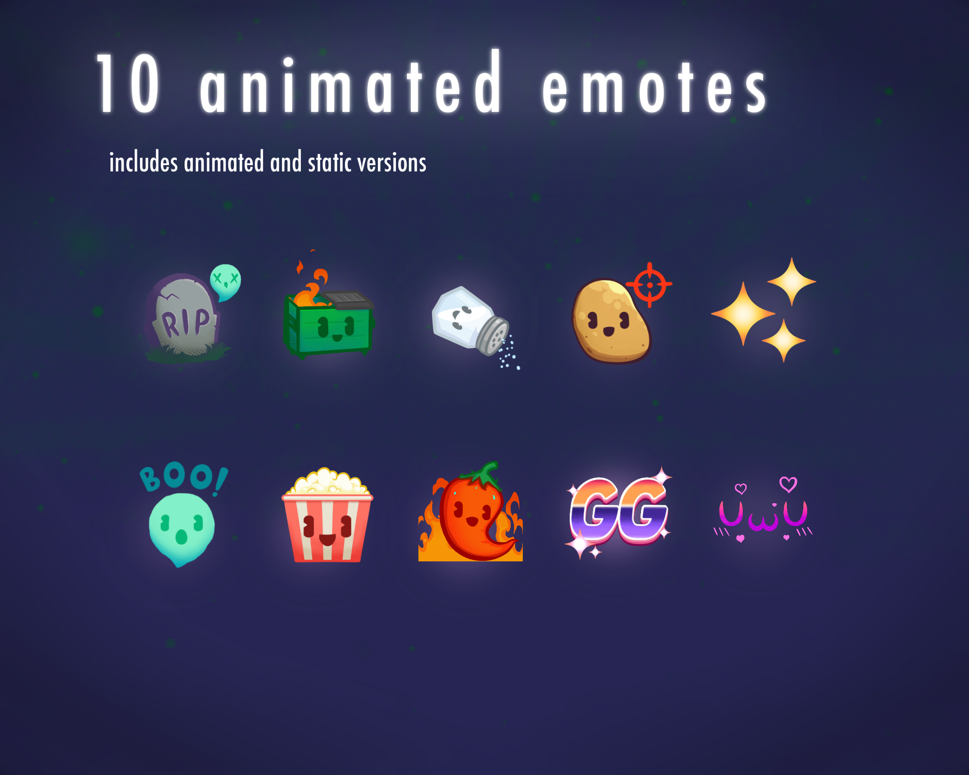 -10 animated emotes in sizes: 256x256, 128x128, 112x112, 56x56, 28x28 (gif)