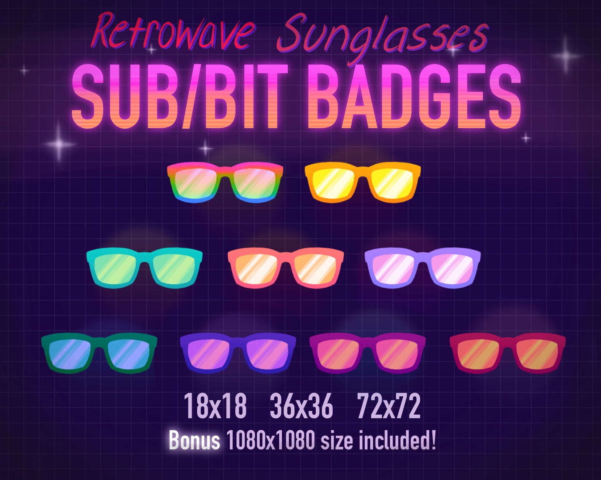Show off some Retrowave style with these hand drawn Sunglasses sub badges!