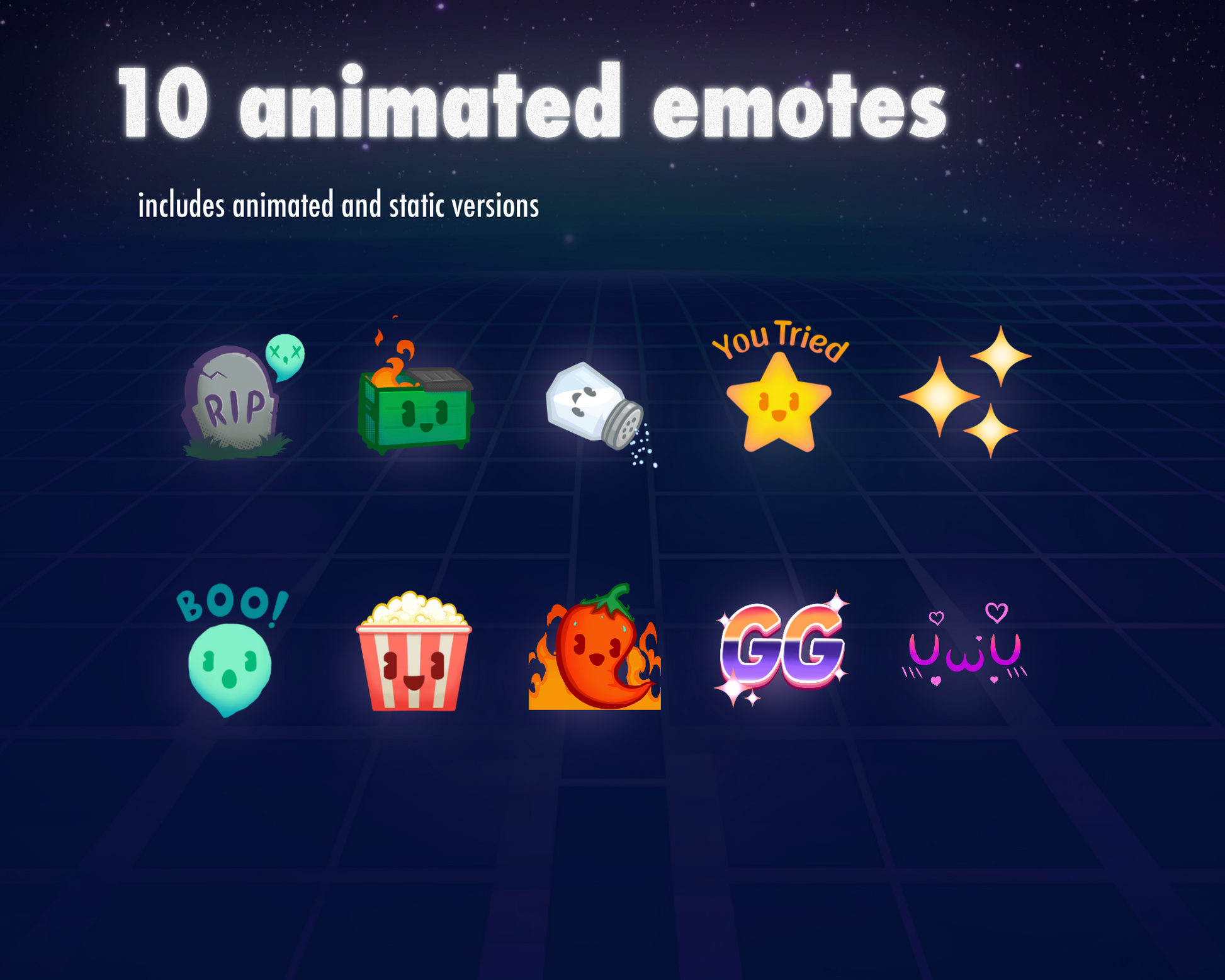 -10 animated emotes in sizes: 256x256, 128x128, 112x112, 56x56, 28x28 (gif)